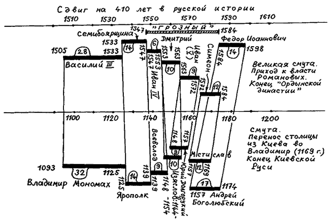 Рис. 2(1). Хронологический сдвиг на 410 лет в русской истории. Обнаружен математико-статистическими методами.