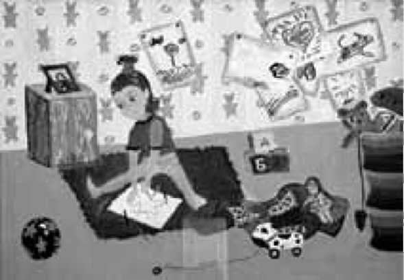 Мишка слева ужасно живой и вот-вот вылезет к нам, а девочка и кукла как бы обе — куклы. Лицо у девочки, хотя и прорисовано чётче, но всё же холоднее, чем личико куклы. Кукла лежит свободнее, находясь как бы в позе девочки, чем девочка — которая как бы застыла в позе куклы. Халатик у куклы — в тёплых тонах, а глаза и маечка девочки — в холодных. И таким образом девочка и кукла сближаются.
