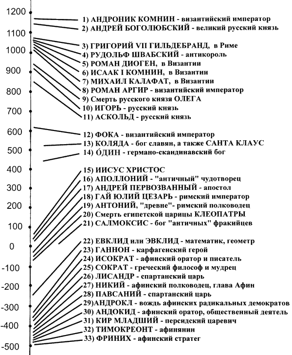 Рис. 0.2. Распределение в скалигеровской хронологии найденных нами пятидесяти четырех отражений императора Андроника-Христа. Хорошо видны сгущения «фантомов», ошибочно помещенные историками в искусственно удаленные эпохи. Первая часть таблицы.