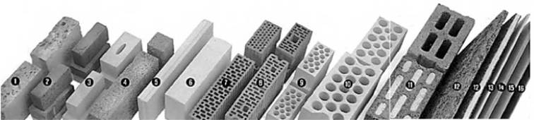 Структура современных строительных материалов и изделий. Бетон и сплошной кирпич высокой прочности: 1 – бетон, 2 – сплошной кирпич, сплошной голландский кирпич, 3 – силикатный кирпич. Сплошной и пустотелый кирпич низкой прочности: 4 – сплошной кирпич из легкого бетона, например из пемзобетона, керамзи та и т. д., 5 – гипсовая пазогребневая плита, 6 – газобетон, 7 – кирпич с вертикальными пустотами, 8 – легкий кирпич с вертикальными пустотами, например из однородного пористого бетона, 9 – силикатный пустотелый кирпич, 10 – силикатный пустотелый блок, 11 – пустотелый блок из легкого бетона, например из пемзобетона, керамзита и т. д. Изделия и материалы для полых стен и перегородок: 12 – легкая древесностружечная плита, 13 – гипсокартонная плита, 14 – легкая гипсокартонная плита, 15 – древесностружечная плотная плита, 16 – фанера, 17 – твердая древесноволокнистая плита. Ниже помещены рисунки дюбелей, соответствующие тому или иному материалу (в подписях к рисункам указан номер подходящего материала ).