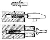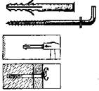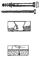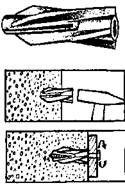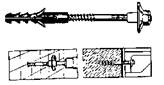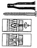 Нейлоновый анкерный дюбель для крепления дверных полотен, облицовочных панелей к стене с неглубокими пустотами. На конце дюбеля — складное устройство. Оно вместе с дюбелем проходит сквозь отверстие, а потом к нему подтягивается при вращении винта. При этом устройство раздвигается и превращается в анкер, напоминающий «бульбочку» (7-11).