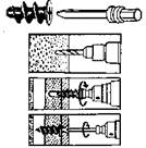 Нейлоновый «рамный» дюбель с эластичными внешними полукольцами. Они в сплошной стене действуют как распорка, а встречаясь с пустотами, превращаются в анкерный упор. Раздвинутые полукольца, упираясь в стенки гнезда, препятствуют проворачиванию дюбеля вместе с винтом. Значительная длина дюбеля не позволяет опрокидываться присоединяемым конструкциям, например деревянным каркасам (1-17).