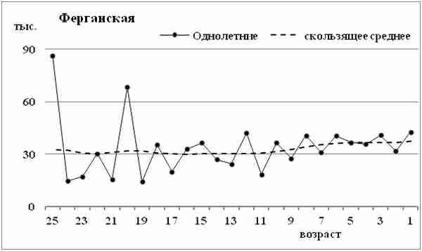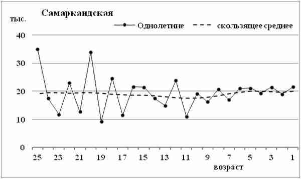 Как видите, численности смежных возрастов областей Туркестана имеют тоже очень большой разброс значений, как и в Закавказье. Оценивать тренд «моделью скользящего среднего» по трем смежным возрастам — смысла нет. Более сложная «модель скользящего среднего» из пяти цифровых операций показывает результат в виде длинной волны.