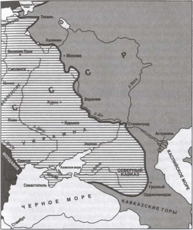 На этой карте схематически показано расположение линии фронта в середине ноября 1942 года. Хорошо видно, насколько далеко вперед вырвались германские войска на юго-востоке СССР.