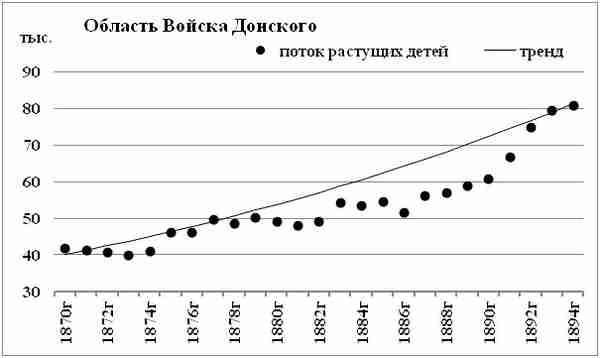 Область Войска Донского примыкает к Воронежской. Саратовской и Астраханской губерниям. Характер потока растущих детей Области Войска Донского существенно отличается от потоков этих губерний. В потоке Области Войска Донского большая неравномерность. Похоже на поток влиял не только катаклизм начала 1990?х. но и были какие–то другие причины, которые влияли на детей, рожденных еще в 1880?е годы. Ежегодный прирост потока растущих детей Области Войска Донского — около 3%.