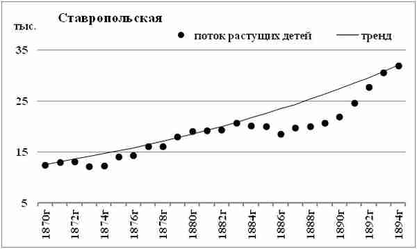 Поток растущих детей Ставропольской губернии подобен потокам губерний Черноземного Центра и Нижнего Поволжья. Отличие в том, что начало провала приходится не на 1886, а на 1884 год. Так что катаклизм начала 1990?х в Ставропольской губернии подействовал не только на детей самого младшего возраста, но и на детей ближе к 10-летнему возрасту. Ежегодный прирост потока растущих детей Ставропольской губернии до 1883 года, в среднем — около 4%. Что существенно больше, чем в центральных губерниях. Глубина провала относительно линейного тренда — около 20%.