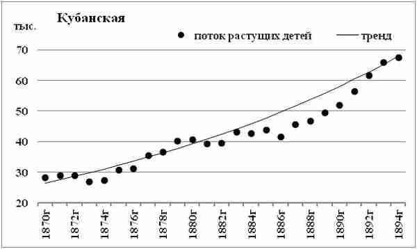 Поток растущих детей Кубанской области подобен потоку Ставропольской губернии. Но глубина провала относительно линейного тренда меньше — около 10%. Ежегодный прирост потока растущих детей Кубанской области, в среднем — около 4%.