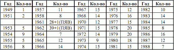 В период с 29 августа 1949 г. по 24 декабря 1962 г. на СИП проводились наземные и воздушные ЯВ – всего 116 плюс два подземных ЯВ (26% всех ядерных испытаний на этом полигоне), а с 15 марта 1964 г. по 19 октября 1989 г. только подземные – всего 338 ядерных испытаний (74%). В целом на полигоне произведено 456 испытаний (64% от всех ЯИ в СССР) (табл. 3.3).