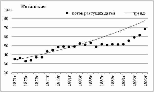 Казанская губерния примыкает к Нижегородской губернии. В ней прирост потока растущих детей до 1885 года менее равномерный, чем в Нижегородской и прирост потока меньше — около 3,0%. Затем в 1890?х годах провал относительно тренда — около 20%.