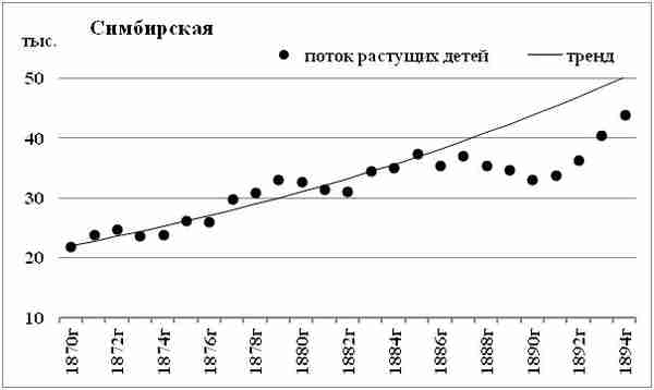 В Симбирской губернии прирост потока растущих детей до 1885 года — около 3,5%. Затем провал — около 25%.