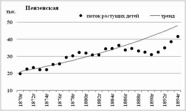 В Пензенской губернии поток до 1885 года подобен потоку в Симбирской губернии. Прирост потока — около 3,5%. Провал в 1890?х относительно тренда — около 25%.