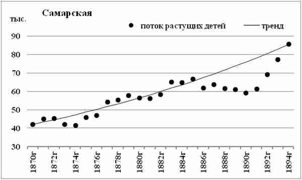 В Самарской губернии прирост потока растущих детей до 1885 года — около 3,5%. Затем провал относительно тренда — около 20%. То есть, как и в Казанской губернии.