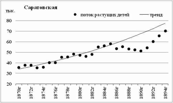 В Саратовской губернии прирост потока растущих детей до 1885 года — около 3,5%. Затем провал относительно тренда — около 25%. Так что во всех северных губерниях Нижнего Поволжья в первой половине 1890?х свирепствовал «Царь–Голод», аналогичный губерниям Черноземного Центра и Нижегородской губернии.
