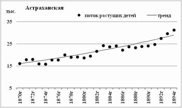 Средний прирост потока растущих детей Астраханской губернии — около 2,5%, что заметно меньше, чем в северных губерниях Нижнего Поволжья. Но существенного провала в середине 1880?х в Астраханской губернии нет. Так что такого сильного катаклизма, как в северных губерниях Нижнего Поволжья и Черноземного Центра, в Астраханской губернии — похоже, не было.