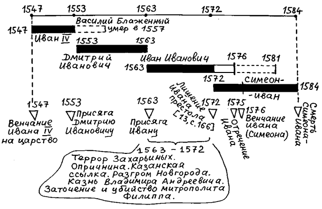 В 1547 году 16-летний Иван IV Васильевич был венчан царем [13, с. 23]. Новому царю была принесена присяга. Его женой (по нашей гипотезе, первой и последней) была Анастасия Захарьина (Романова). Отец жены — РОМАН Захарьин — родоначальник будущих Романовых [6, с. 94]. Правление Ивана Васильевича продолжалось до 1553 года. Самым знаменитым событием его правления было покорение Казани в 1552 году. В следующем 1553 году Иван Васильевич серьезно заболел. К этому времени у него уже был малолетний сын Дмитрий, а вскоре родился второй сын Иван [6, с. 109]. Историки считают, что Дмитрий погиб сразу же после «кризиса». По нашей гипотезе, это не так. «Иван IV занемог тяжким огненным недугом. Он бредил в жару, перестал узнавать близких людей. Кончины его ждали со дня на день. Вечером 11 марта 1553 года ближние бояре присягнули на верность наследнику престола грудному младенцу Дмитрию» [13, с. 48].