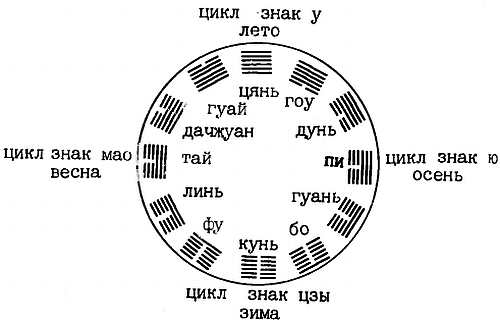 Опираясь на закономерности сбалансированного процесса поступления в организм человека инь и ян, сопровождающегося попеременным усилением активности одного и подавленностью другого, Вэй Боян вычленил 12 гексаграмм, символизирующих закономерности основных физиологических изменений, характерных для человеческого организма (схема 3), и рекомендовал их в качестве опоры для занятий цигун.