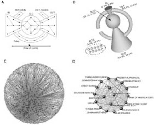 Анализировалась деятельность 43060 транснациональных корпораций по состоянию на «докризисный» 2007 год (рис. С). Выяснилось, что 600 % их активов принадлежали всего 1318 структурам, а 147 самых крупных из них имели две трети от этой доли, то есть 40 % (рис. D). Вполне нормальное, по меркам математики, распределение для единой большой системы. Предложенная в итоге граф-модель мировой экономики напоминала галстук-бабочку (bow-tie), «узлом» которой служили именно эти неполные полторы сотни «избранных» (рис. А). Среди которых четыре десятка «сверхгигантов» выступали в качестве истинного «ядра» всей системы. Эти «сверхгиганты» публичной глобальной экономики вовсе не являются «черными дырами» или «темной материей» – наоборот, все они «на слуху»: кто в большей, кто в меньшей степени, и о каждом можно написать не то, что книгу, а целую библиотеку. Вот эта «группа 40», контролирующая около 33 % мировых активов: