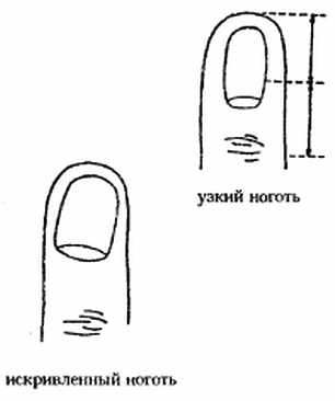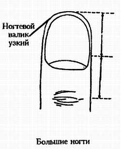 Когда изучают цвет ногтей, прежде всего обращают внимание на большой палец. Нездоровый цвет и отсутствие глянца у ногтя большого пальца на правой или левой руке свидетельствует о наличии проблем с сердцем. Впрочем, если цвет матрикса ногтя большого пальца руки нельзя назвать здоровым (а также в случае, если матрикс несколько краснее, чем он должен быть), то даже при нормальной пигментации самого ногтя можно предположить, особенно у женщин, отклонение гормонального статуса от нормы. Хотя форма ногтей у каждого человека очень индивидуальна, все же можно выделить несколько основных категорий, а именно: обычные ногти, большие ногти, маленькие ногти, длинные ногти, короткие ногти, широкие ногти, узкие ногти, ногти в форме раковины, ложкообразные ногти больных туберкулезом и т. п. Многие формы ногтей не имеют названия или являются аномальными.