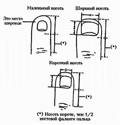 Короткими называются ногти, длина которых равна ширине. Название “широкий ноготь” означает, что ноготь в ширину больше, чем в длину. Маленьким называют ноготь обычной формы, если латеральный ногтевой валик по обеим сторонам ногтя отличается большими размерами, а сам ноготь меньше, чем половина ногтевой фаланги пальца.