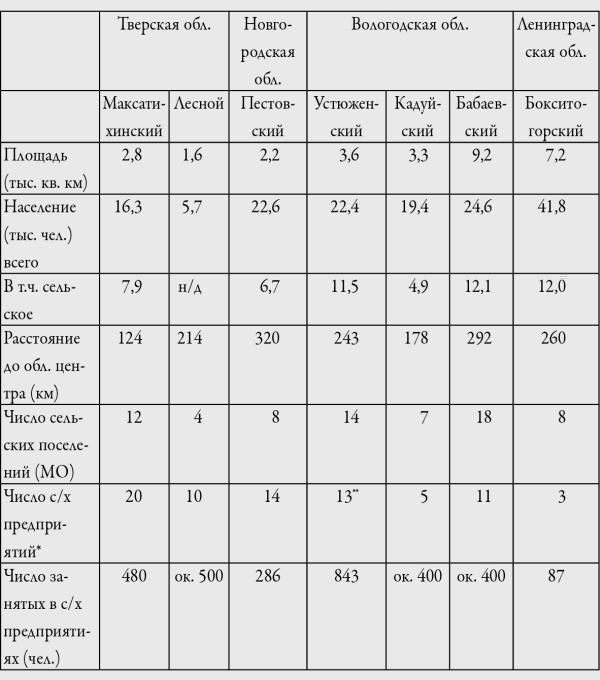 ** Хотя в дер. Никола Устюженского района 69 реально работающих крупных и средних фермерских хозяйств («деревня фермеров»), некоторые из них являются КФХ или даже ЧП (такие формы отчетности встречаются среди фермерских хозяйств и в других районах). Мы логику статистической отчетности районов менять не стали и интервью брали только у руководителей тех хозяйств, которые шли по строке сельхозпредприятий. Поэтому в Устюженском районе указано 13 с/х предприятий.