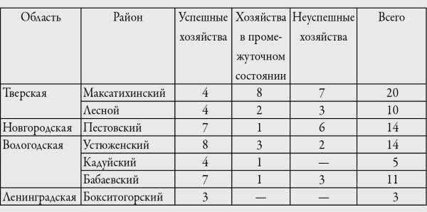 Третья – «демонстративная» – стратегия в Пестовском районе Новгородской области, где район оказывает поддержку исключительно крепким и «нужным» хозяйствам, а остальные «пущены на самотек», что отразилось в показателях количества успешных и неуспешных предприятий района. Подобный результат выявился и в Лесном районе Тверской области, руководство которого старалось в рамках своего небольшого бюджета максимально поддерживать предприятия, спасая их от полного невнимания со стороны области. Политика руководства Бокситогорского района состояла в полном дистанцировании от проблем сельского хозяйства, в результате чего оно практически исчезло, если сравнивать с прежними временами. Однако в последние годы курс изменился в сторону поддержки частной инициативы высокоресурсных, опытных и инициативных предпринимателей, что сразу отразилось на количестве успешных предприятий.