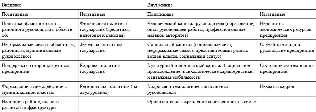 В результате систематизации и обобщения оценок нашими респондентами социально-экономических условий развития сельского хозяйства, анализа ресурсов и капиталов, которыми располагает сельский предприниматель, были обозначены факторы успешности/неуспешности предпринимательской деятельности на селе, которые в целом исследователи подразделили на внутренние и внешние, позитивные и негативные. «Успешность/неуспешность» в данном случае является экспертной оценкой, в рамках анализа она была определенным образом операционализирована через увеличение или уменьшение производственных показателей предприятия, финансовую обеспеченность, состояние техники и кадров, общую стратегию развития и т. д.