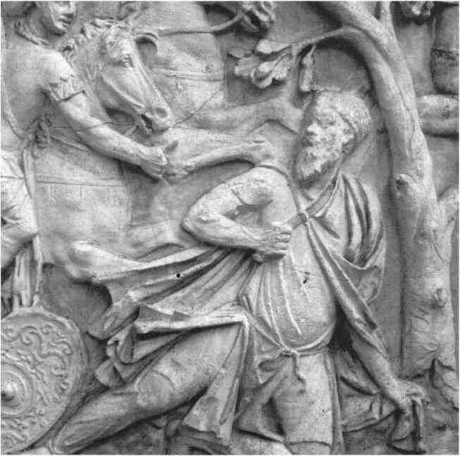 Среди всевозможных разновидностей гимнастических танцев античности особо важными считались танцы воинов, изобретение которых приписывалось богине Минерве. Самым впечатляющим из них был корибантум. Этот фригийский танец носил смешанный характер: в нем прослеживаются черты боевого, религиозного и мимического танцев. Вооруженные танцоры подпрыгивали, подбрасывая оружие вверх и лязгая им. Так они имитировали корибантов, старавшихся заглушить крики новорожденного Зевса на Крите[301]. Сохранился терракотовый барельеф, изображающий пиррический танец двух корибантов, или, как их называли на Крите, куретов, вооружённых короткими листовидными греческими мечами-ксифосами[302].
