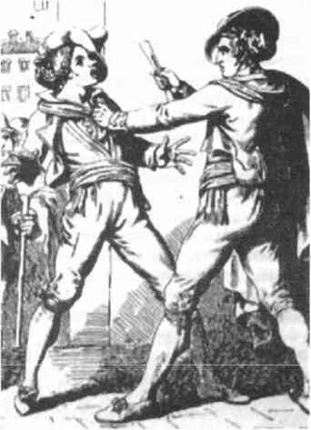 Любовью к поножовщине славились и некоторые выдающиеся деятели эпохи Возрождения. Так, например, привычкой хвататься за нож по любому поводу был известен прославленный флорентийский скульптор, ювелир и живописец Бенвенуто Челлини. За любовь к кинжалам и ножам неоднократно задерживался и другой его современник — великий итальянский художник, один из крупнейших мастеров барокко Микеланджело Меризи да Караваджо. Его биограф Варриано писал, что об интересе Караваджо к холодному оружию свидетельствует датированная 1605 годом перепись его имущества, а также полицейские протоколы зафиксировавшие его многочисленные аресты по обвинению в незаконном хранении оружия[256]. В архивах римского трибунала сохранился черновик одного из протоколов, описывающий шпагу и кинжал, конфискованные у художника при задержании. А из переписи личного имущества Караваджо, составленной в 1605 году мы узнаём, что он владел двумя шпагами, двумя дуэльными кинжалами и большим ножом. Некоторые исследователи творчества художника, считают, что многочисленные изображения шпаг и кинжалов на его картинах, отражали не только тягу Караваджо к насилию, но и то, что холодное оружия являлось для него символом чести[257].