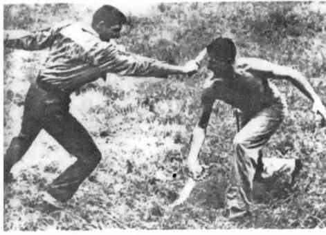 Широко применялся в бою на ножах и другой старинный технический элемент, известный сегодня как «обратный порез». Эта техника, известная у испанцев как мандобле, и называемая Мароццо трамаццоне, или страмаццоне, представляла собой рубящий удар кончиком шпаги, наносившийся взмахом запястья. Также использовался и трамаццоне роверсо — тот же удар, но наносимый на возвратном движении. Среди техник ножа, уходящих корнями в старинное итальянское фехтование на шпагах, можно упомянуть и такой широко известный, узнаваемый и ставший уже каноническим «бота» — элемент, как останавливающий укол в нижний уровень, или пассата-сотто, изобретателем которого считается итальянский мастер XVII столетия Франческо Антонио Марчелли[498]. Известный фехтовальщик викторианской эпохи Эгертон Кастл отмечал, что пассата сотто считалась у итальянцев крайне полезным техническим элементом[499].