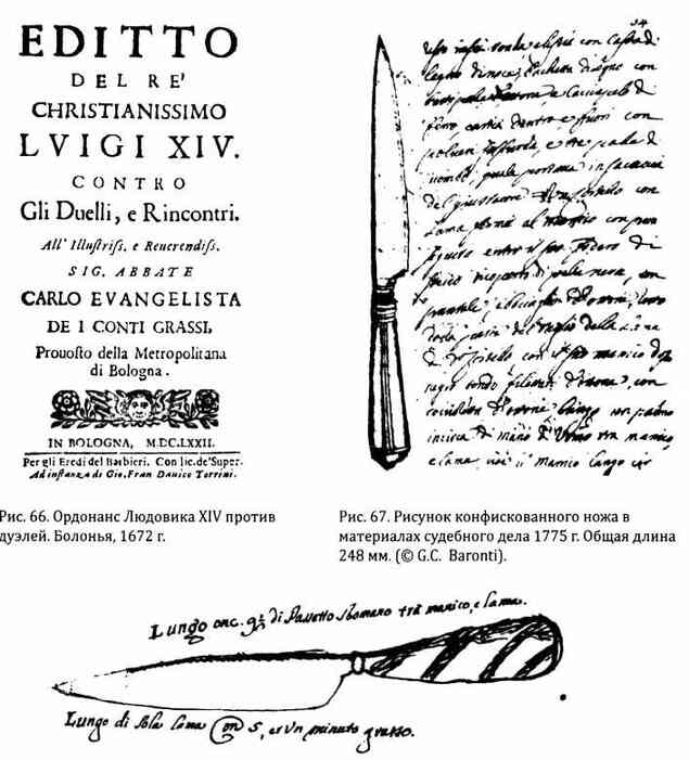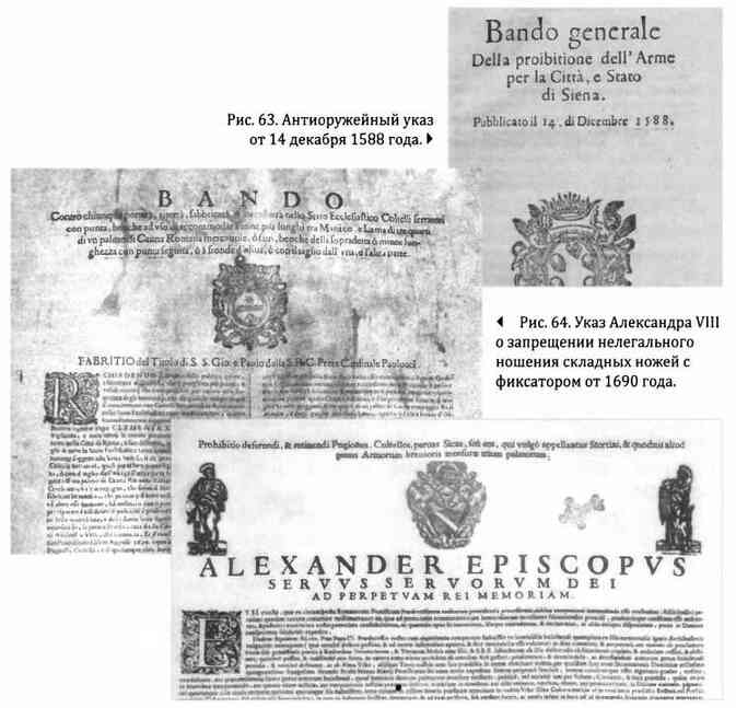 Занимательно, что закон особо оговаривал маленькие ножи, от рукояти и до острия не превышающие в длину «tre quarti di braccio di misura Fiorentina» — «три четверти флорентийского локтя». Это было связано с тем, что ножи длиной от 14 до 44 сантиметров, считались достаточно длинными для убийства, и в то же время достаточно короткими для скрытого ношения[512]. Большинство запретов, относилось именно к ножам с короткими клинками, поскольку считалось, что их легче спрятать, и что они более эффективны, когда необходимо застать противника врасплох.