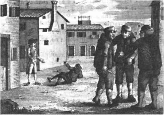 Этой системой защиты преступников также был поражён немецкий историк и писатель Иоганн Вильгельм Архенгольц, путешествовавший по Италии вскоре после Мура. В 1791 году он писал, что во время посещения им этой страны поединки на ножах чаще встречались в Генуе, Неаполе и на Сицилии, чем в Тоскане и на территории Папского государства. Вероятно, это можно объяснить тем, что в описываемый период непримиримую борьбу с дуэлями на ножах вёл легендарный римский губернатор Спинелли. Сбирри, патрулировавшие улицы с наступлением темноты, были уполномочены градоначальником проверять карманы любого встреченного жителя города. Если у кого-либо при досмотре обнаруживали нож, то осуждение к галерам было неизбежно вне зависимости от положения задержанного. Но Архенгольц отметил, что даже несмотря на жесточайшие меры, принимаемые Спинелли, церкви, защищённые своими привилегиями, всё так же продолжали покрывать убийц. И поэтому преступники не прекращали обивать пороги церквей, а церкви всё так же становились их обителью на недели, месяцы или годы[519]. Но и к полицейским, призванным наводить порядок, Архенгольц относился без особого пиетета и отмечал, что сбирри — итальянская городская стража, добровольно появляются с большой неохотой и если уж долг всё-таки заставляет их это сделать, они предпринимают все возможные меры предосторожности[520].