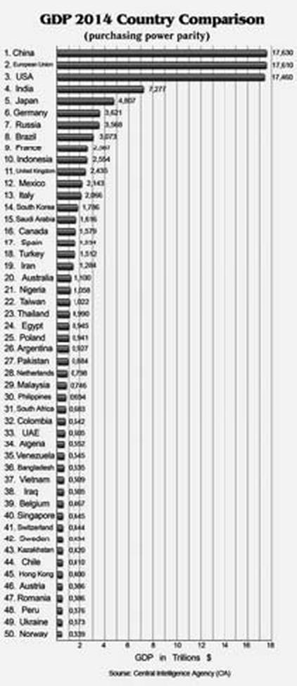 Кроме того, надо всегда иметь в виду и разницу исходных показателей. Если за последние 15 лет, за период с 1999 по 2014 г. экономика США выросла в долларовом эквиваленте в 1,8 раза (с 9,66 до 17,43 трлн. долларов), то за тот же срок экономика Китая увеличилась в 9,5 раз (с 1,09 до 10,36 трлн.!)