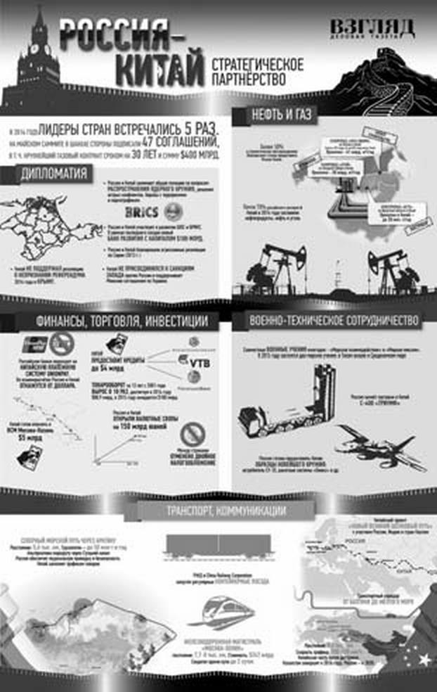 Важным шагом к укреплению российско-китайского энергетического альянса стало подписание 12–14 октября 2014 г. Московских соглашений, по итогам которого «Роснефть» и Китайская национальная нефтегазовая корпорация (CNPC) начали переговоры по поводу поставок сжиженного природного газа из России в Китай с месторождений проекта «Сахалин-1» – для этого к 2018–2019 гг. в России планируется построить завод по сжижению газа мощностью в 5 млн. тонн в год. Кроме того, согласно подписанному договору «Газпром» получит от CNPC предоплату на 25 млрд. долларов для развития месторождений углеводородов и для строительства газопровода «Сила Сибири», по которому российский газ пойдет с Чаяндинского месторождения в Якутии в Приморский край и страны Азиатско-Тихоокеанского региона.