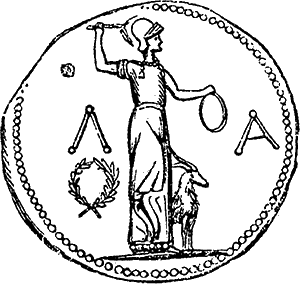 Рис. 1.101. Аполлон Амиклейский. Историки отмечают: «Аполлон Амиклейский, изображенный на древних монетах, дает нам представление о первых образах бога, которые существенно отличаются от типа Аполлона более позднего периода» [524:1], с. 205. Взято из [524:1], с. 205, илл. 198.