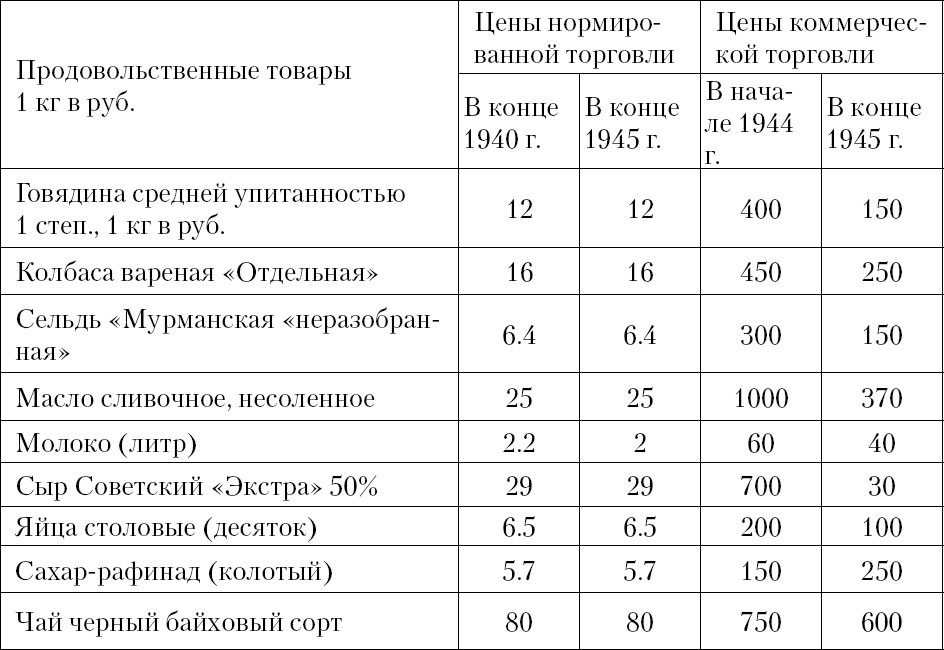 Несмотря на невероятные трудности, обращалось большое внимание на обеспечение населения продуктами питания, удешевление их. Государственные розничные цены нормированной и коммерческой торговли на отдельные продовольственные товары (в руб. за 1 кг) показаны в таблице: