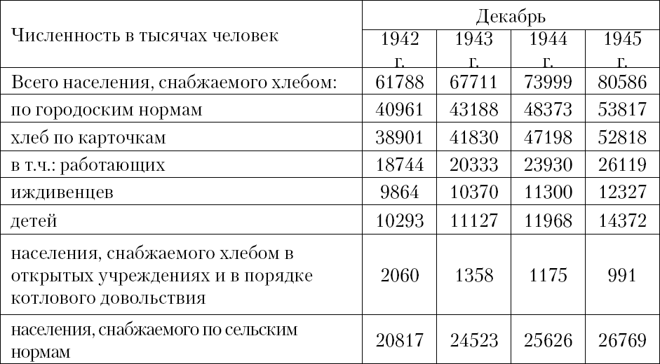 Наряду с военными делами, работами по восстановлению разрушенного войной, главной заботой Государственного комитета обороны было обеспечение жителей страны прежде всего хлебом. Все военные годы, начиная с первого, численность населения, состоящего на государственном снабжении хлебом (тыс. человек, включая учащихся ФЗО и РУ),[30] увеличивалась, что видно из нижеследующих данных: