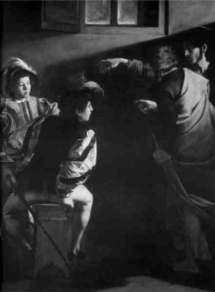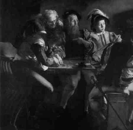 Рис. 1.48. «Призвание апостола Матфея». Караваджо. 1599–1600 годы. Левая часть картины. Взято из [143:0], с. 432.
