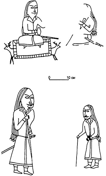 Приведенные выше данные о прическах соотносятся с прическами персонажей на стеле из Мунгут-хяса. Прежде, когда все исследователи пользовались неуточненными копиями рисунков на этой стеле, со ссылкой на них делались неверные заключения о прическе древних тюрков. А.Д. Грач, например, писал: «Свидетельства древних китайских хроник наглядно подтверждаются изображением тюрка-тугю, обнаруженным в местности Бичиктубулан, вблизи Улясутая (Северная Монголия). Оно демонстрирует тюрка в длиннополой одежде, с тростью в правой руке (левая рука сжимает рукоять сабли) и – что самое для нас главное – с длинными, ниспадающими до пояса, распущенными волосами» [Грач, 1961, с. 78–79]. При этом А.Д.Грач, по-видимому, апеллировал к копии Ё. Харады.