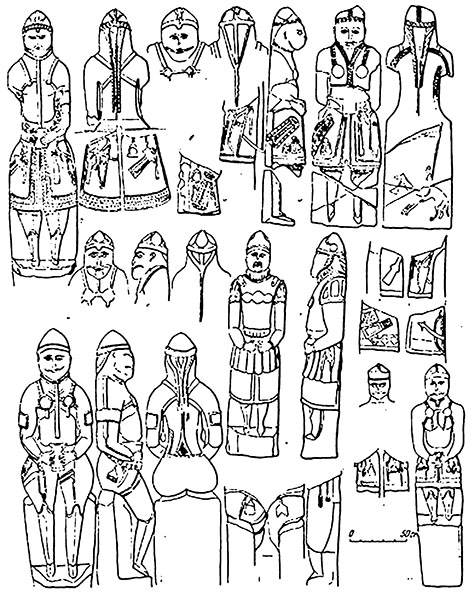 В действительности картина складывается иная. При сравнении новой копии с фотоснимками предшествующих исследователей становится совершенно ясным, что у всех людей, изображенных на стеле, волосы не свободно распущены, а заплетены в косы. Каждая из кос имеет на конце специальное украшение, изображение которого, как было показано, встречается и на других памятниках. Поэтому И.Л.Кызласов совершено справедливо заметил, что волосы фигур со стелы из Мунгут-хяса заплетены в косы [Кызласов, 1998, с. 44]. Определить точное число кос здесь затруднительно, так как головы фигур изображены вполоборота, и поэтому прическа видна не полностью (3–4 косы). Если исходить из того, что прическа изображена наполовину, то в целом она могла состоять из 7–8 кос. Это число совпадает с количеством кос на многих «косатых» каменных изваяниях и у персонажей с других изобразительных памятников.