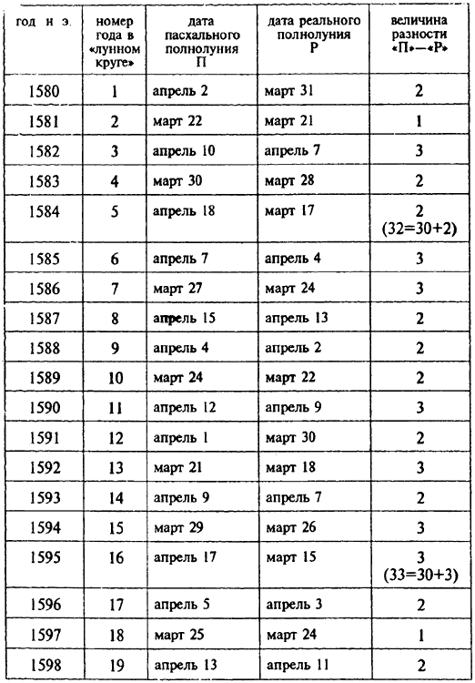 4) Отставание пасхальных полнолуний от истинных составляло в XVI веке не 3–4, а 1–3 дня. Это видно из приводимой ниже таблицы сравнения дат пасхальных и истинных весенних полнолуний в 19-летнем цикле («круг луне») на время григорианской реформы: