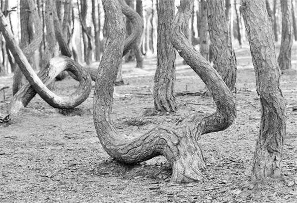 Ни одно дерево в этом лесу не растет ровно. Все искривлены, закручены в спирали и кольца. Здесь всегда стоит мертвая тишина, не растет трава. Звери и птицы избегают Пьяного леса. Лес не древний, его посадили полвека назад, после войны.