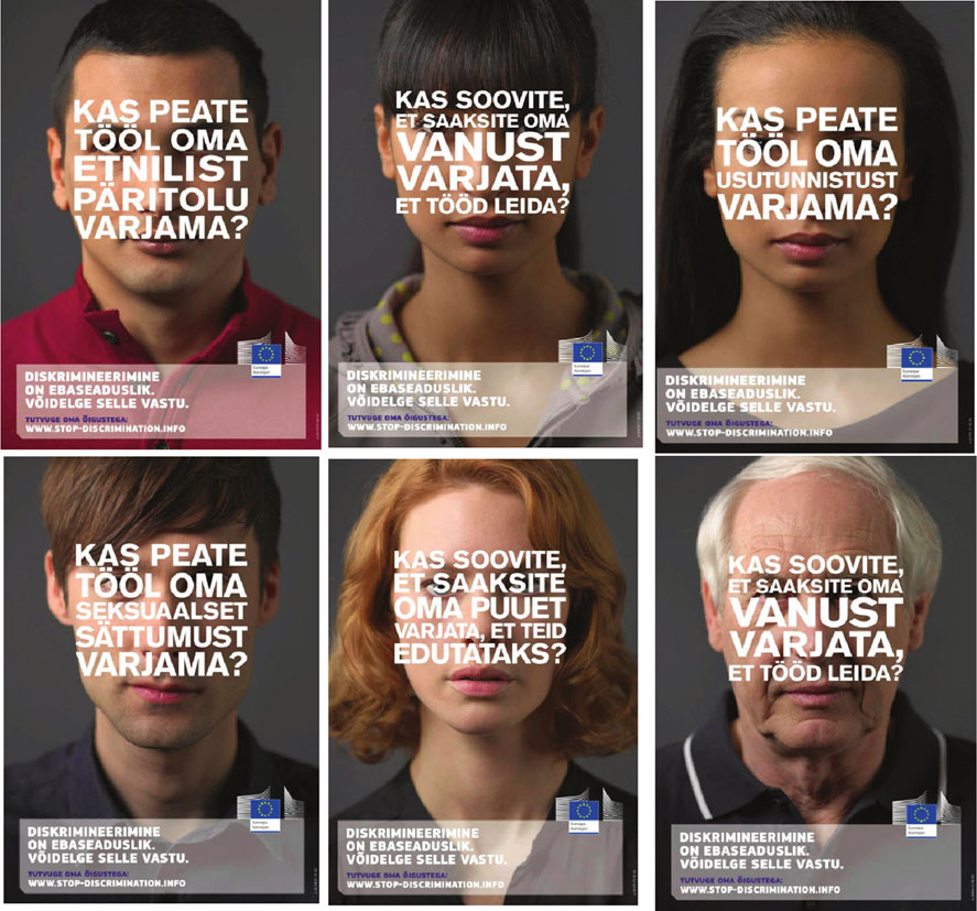 На сегодня можно выделить шесть основных направлений борьбы с неравенством по следующим признакам: этническому, возрастному, тендерному, сексуальной ориентации, вероисповеданию и инвалидности (особых потребностей). Например, в 2012 году при поддержке Европейской комиссии был разработан ряд агитационных плакатов, запущен вебсайт www.stop-discrimination.info. Рисунок 1 отображает несколько эстоноязычных плакатов, призванных бороться с дискриминацией. На плакатах, по сути, звучит один и тот же вопрос – вынужден ли человек скрывать что-либо о себе, чтобы получить работу или быть успешным. Внизу каждого из плакатов помещен призыв о том, что дискриминация противозаконна и что с ней следует бороться.