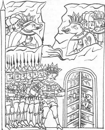 Вероятно, этот рассказ восходит к известному сюжету, содержащемуся в знаменитом русском Лицевом Своде [477:3], Остермановский том, листы 693–695. На рис. 8.33 приведена старинная миниатюра XVII века, посвященная этому сюжету. Поздние художники уже забыли суть дела и простодушно рисовали простенькие ворота с незамысловатым замком.
