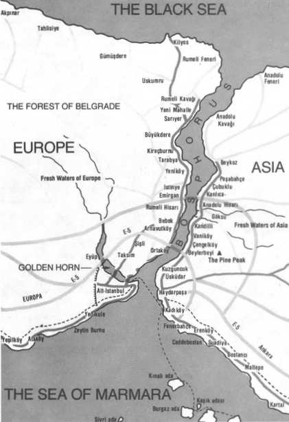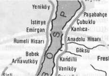 Рис. 8.34. Карта Босфора. На европейском берегу указана крепость Румели-Хисар (Rumeli Hisari), а на азиатском — крепость Анатоли-Хисар (Anadolu Hisari). Это — самое узкое место Босфора, так что обе крепости «запирали» пролив. Взято из [1464], с. 107.