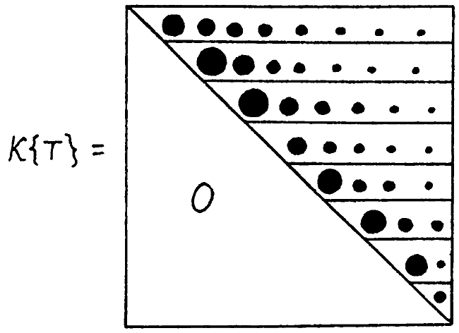 Всего нами было обработано несколько десятков больших исторических текстов. Во всех случаях, когда тексты описывают события эпохи XVI–XX веков, принцип затухания частот подтвердился. Отсюда вытекает методика хронологически правильного упорядочивания «глав-поколений» в тексте или в наборе текстов, где этот порядок нарушен или неизвестен. Рассмотрим совокупность «глав-поколений» летописи X и занумеруем их в каком-нибудь порядке. Для каждой «главы» X(Q) подсчитаем число К(Q, T) при заданной нумерации «глав». Все числа К(Q, T), при переменных Q и T, организуются в квадратную матрицу KT размера n ? n, где n — общее число «глав». В идеальном теоретическом случае частотная матрица KT имеет вид, показанный на рис. 25.