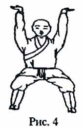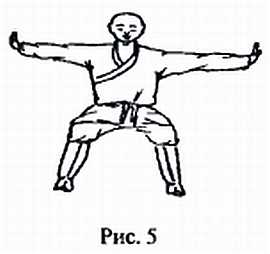 Представьте, что солнце находится совсем рядом перед вами и приятно согревает все ваше тело. Постояв так некоторое время и добившись ощущения тепла во всем теле, левую ногу отставьте из положения… (строку не прочитать из-за дефекта сканирования ☺)… расстояние между ногами было немного шире плеч, колени согните и слегка присядьте, приняв позу “всадника”. Одновременно с этим согните руки в локтях и прижмите их к бокам, кисти поверните ладонями вверх, пальцами вперед (рис. 2).