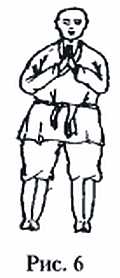 Левую ногу отодвиньте влево на полшага, согните колени и присядьте. Одновременно соедините кисти рук ладонями друг к другу, примите позу молящегося (рис. 6).