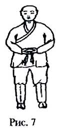 Выпрямите ноги в коленях, слегка сдвиньте их до ширины плеч. Кисти рук соедините так, чтобы кончик среднего пальца левой руки находился на внутренней точке лаогун (середина ладоней) правой ладони, а большие пальцы соприкасались друг с другом (поза Ваджры) и поместите их у нижнего даньтяня (рис. 7).