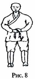 Выполните три глубоких дыхательных цикла, представляя, что вас окружает космическая “семенная ци”. Во время вдоха она непрерывно через поры поступает внутрь тела, а во время выдоха устремляется в нижний даньтянь. Затем, наложив правую кисть на левую (для женщин, наоборот, — левую на правую), поместите руки на животе ладонями к пупку (рис. 8). Выждав в таком положении некоторое время, завершите занятие.