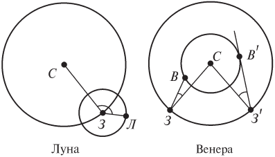 Рис. 19. Элонгация Луны — это угол между векторами ЗС и ЗЛ. Элонгация Венеры — это угол между векторами ЗС и ЗВ. Максимальная элонгация Венеры — угол между З'С и З'В'.